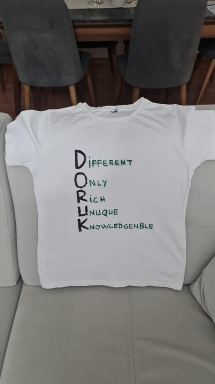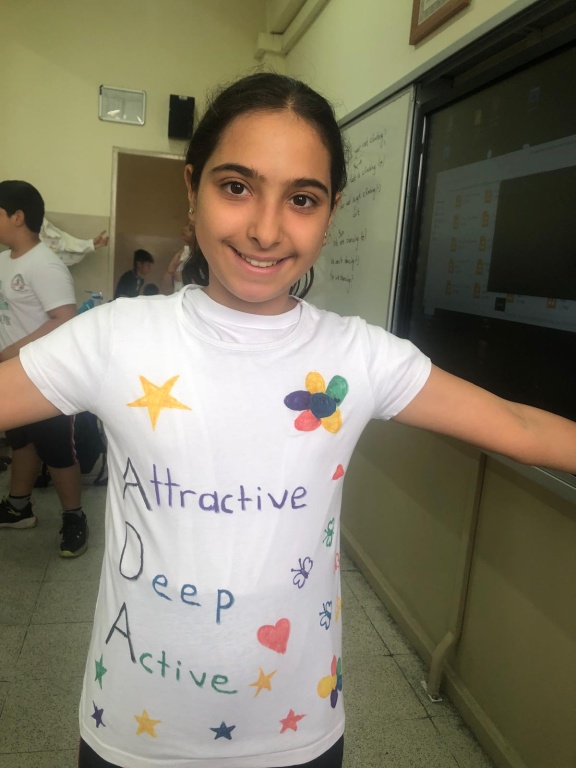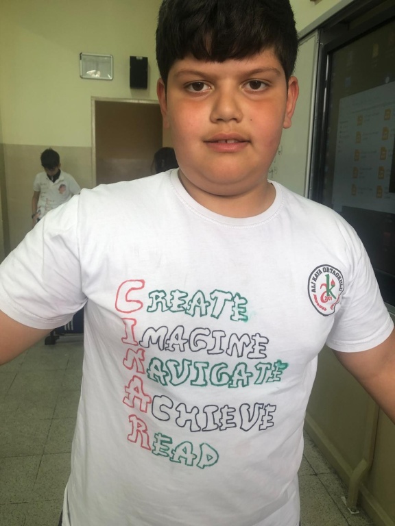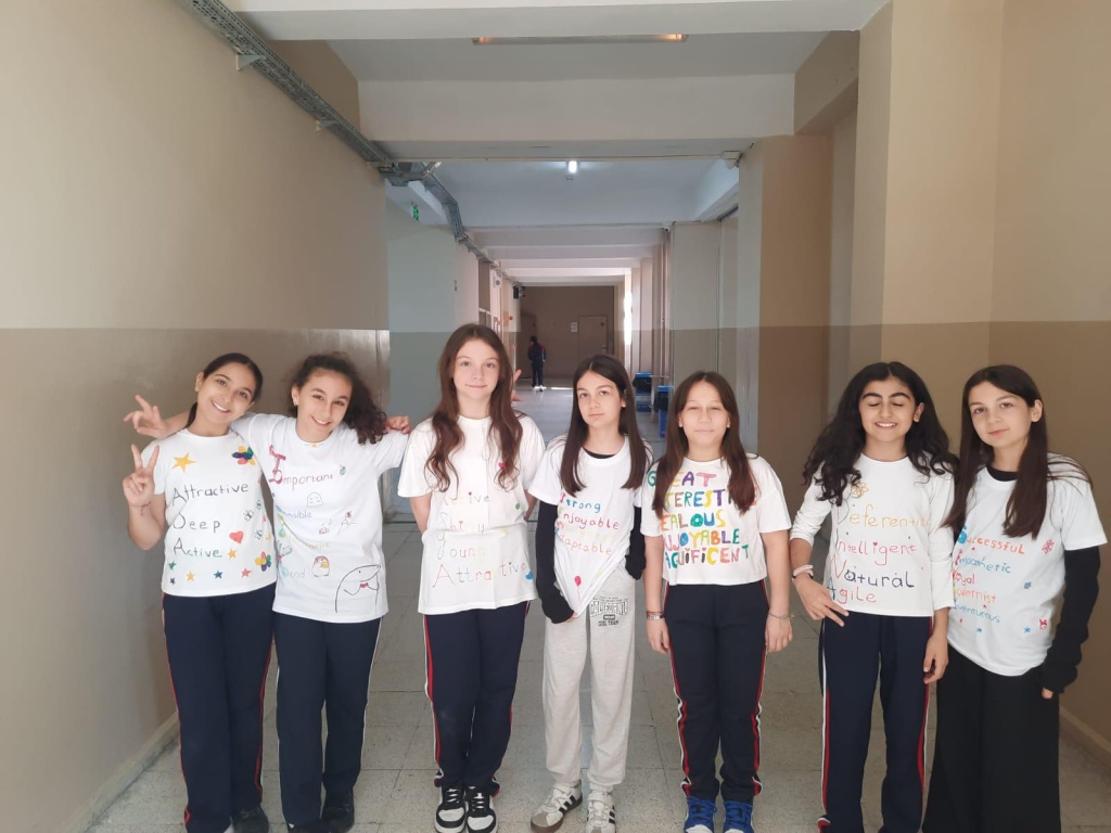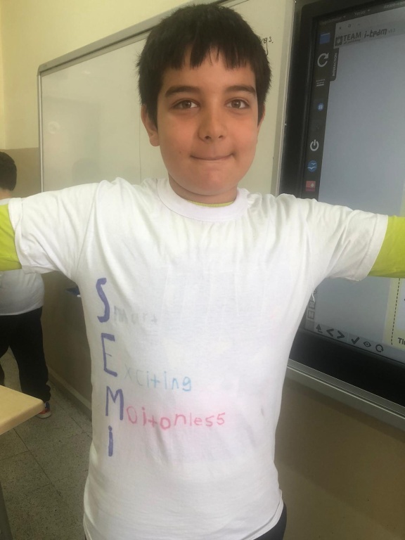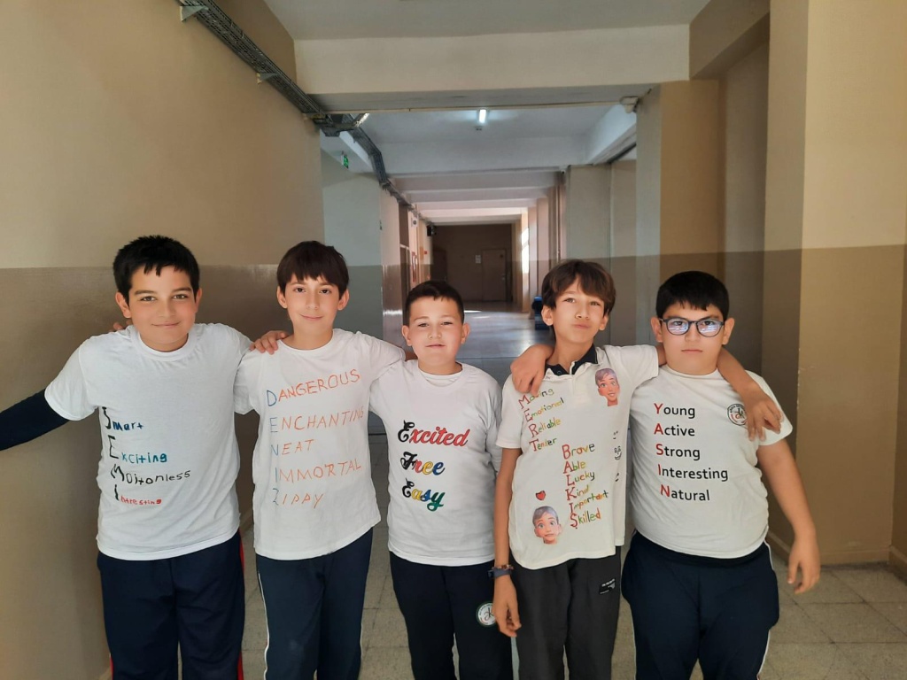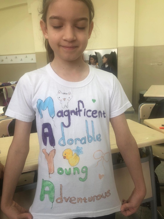 Sıfatları öğrenirken 5. sınıf öğrencilerimiz isimlerindeki harflere göre kendilerini sıfatlarla tanımladılar ve tişörtlerini tasarladılar.